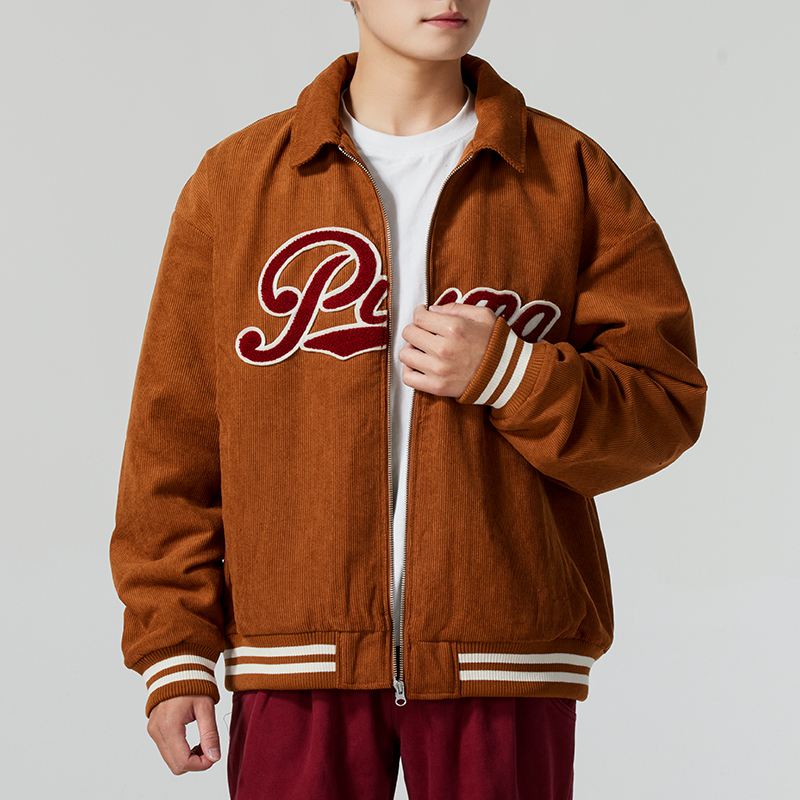 寒い季節のスポーツカジュアルスタイルにぴったりの、茶色コーデュロイ素材のスタジャンです。