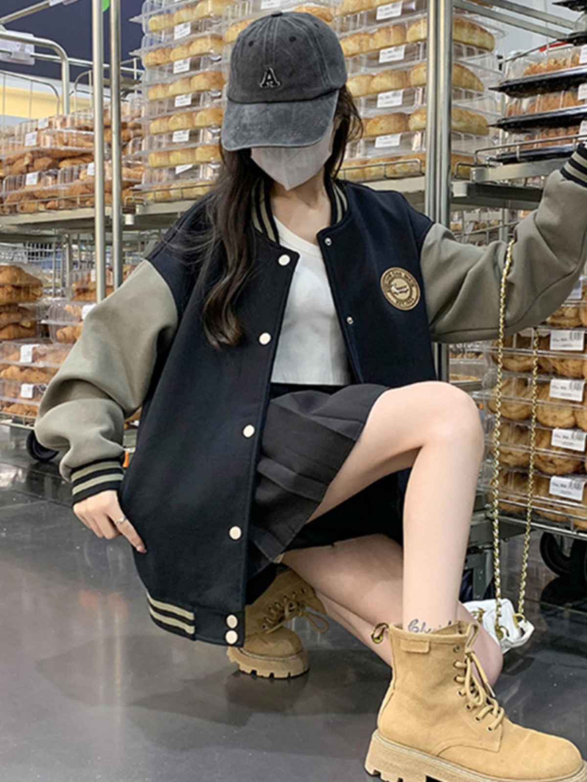 カレッジ風のパッチワークデザインが30代の女性に個性的な魅力を与えるスタジャンです。