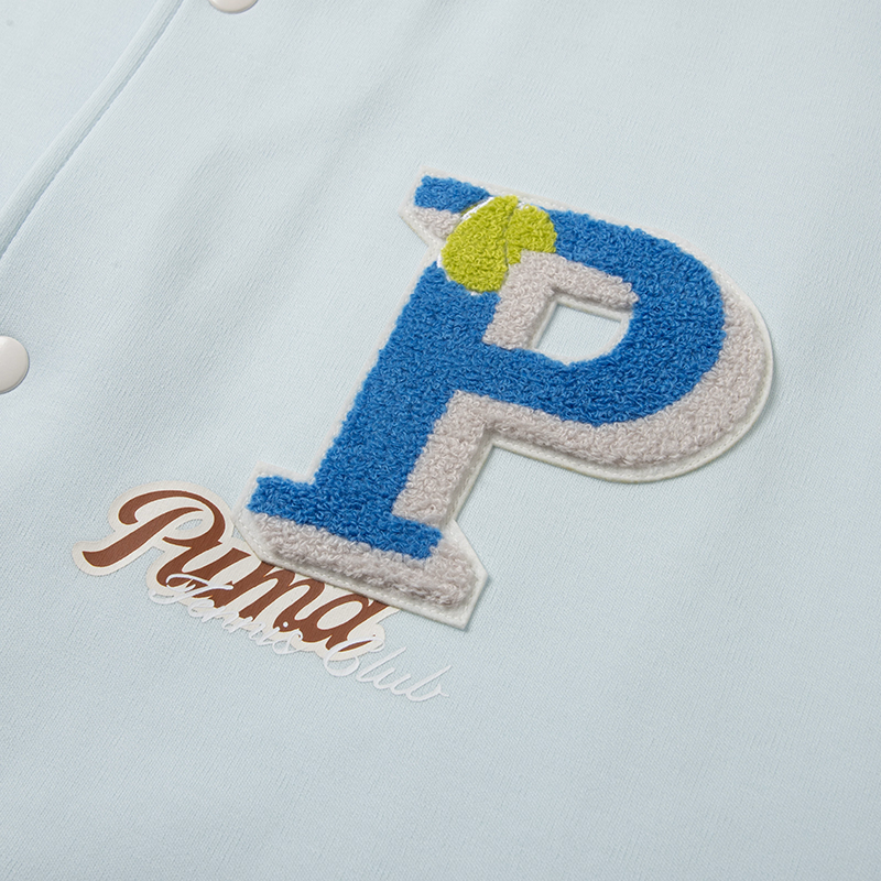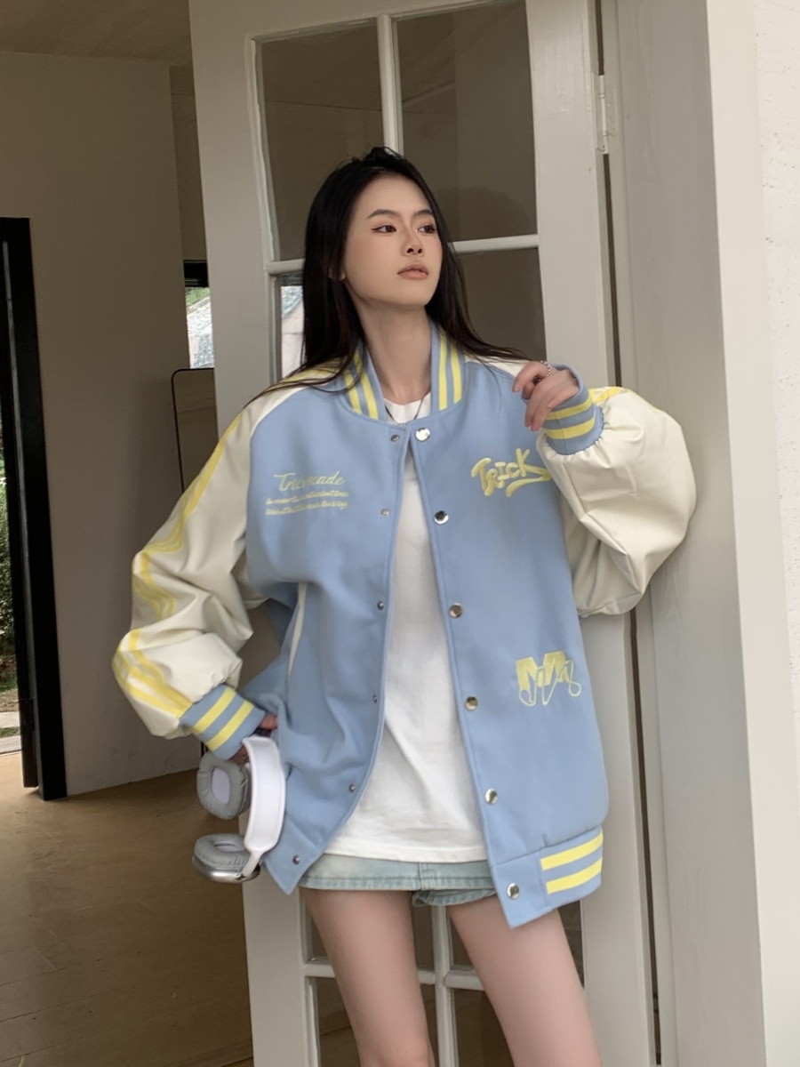 優しいパステルブルーが30代の女性に柔らかな印象を与えるスタジャンです。