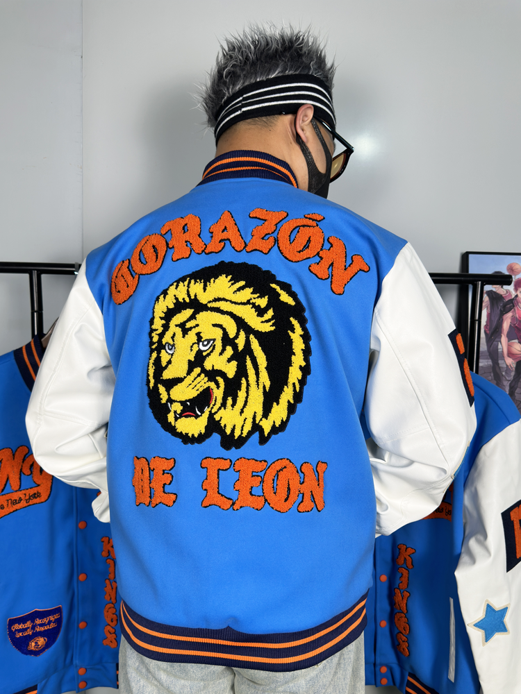 獅子の刺繍が特徴的な伝統的スタジャン。胸と背面に「コラゾン」「獅子になれ」の文字と獅子のデザインが映える一着。