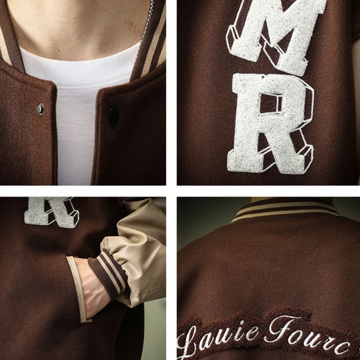 クラシカルな雰囲気を醸し出す茶色のスタジャンです。胸元の紋章風ワッペンがアクセントとなり、学生時代を思い出させる懐かしさと現代的なデザインが融合しています。