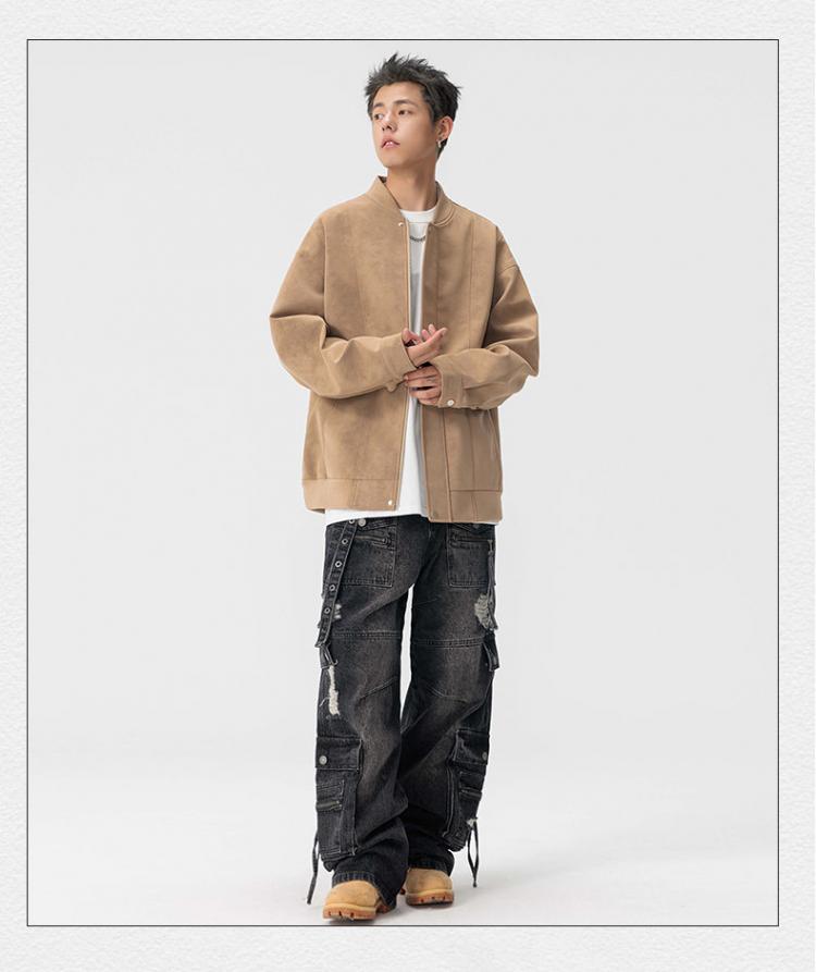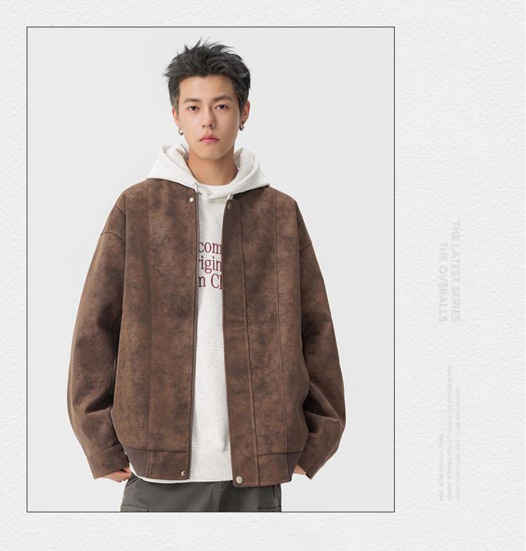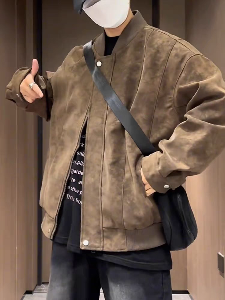 袖の配色切り替えがスタイリッシュで、どんなコーディネートにも合わせやすい一着です。スナップボタンで着脱しやすく、ポケットも実用的な茶色の逸品です。