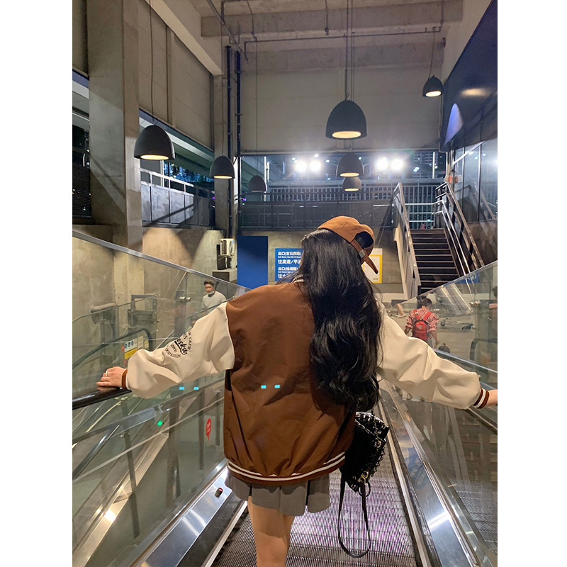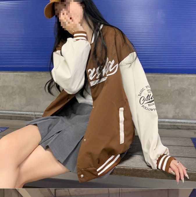 カジュアルなストリートスタイルを演出する茶色のスタジャンです。