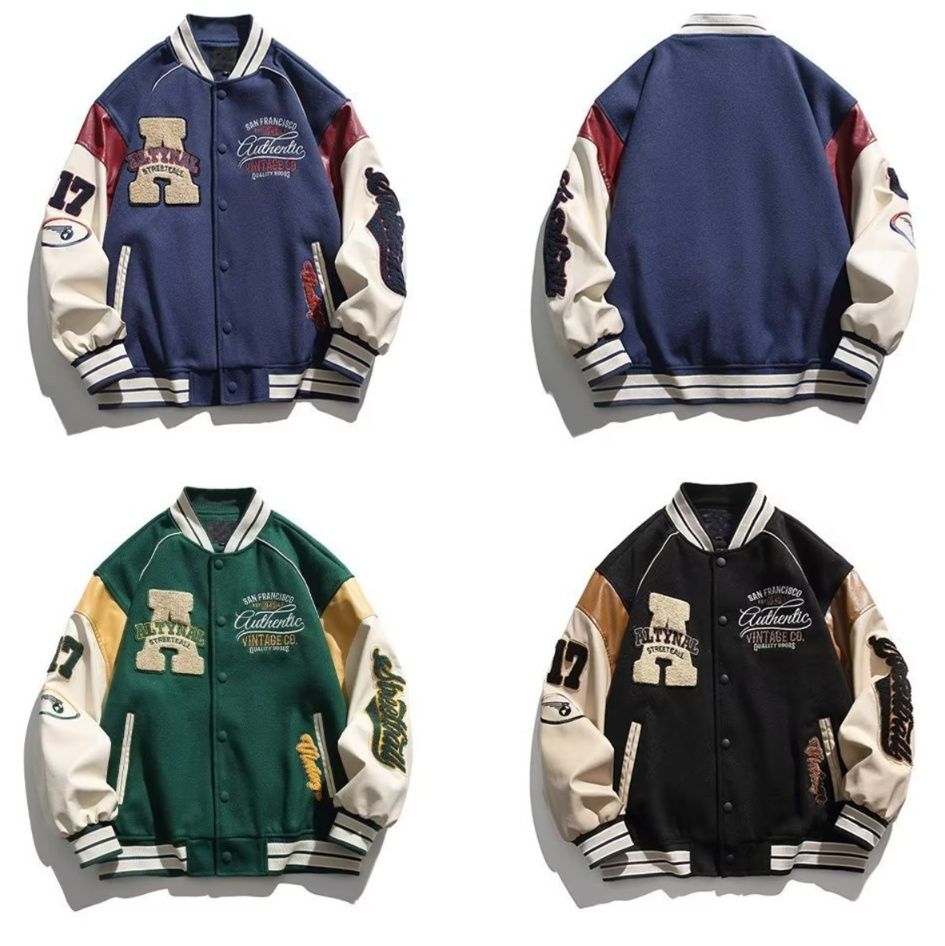 胸元の立体的なアルファベット刺繍と袖の文字ワッペンが、レトロで個性的な雰囲気を演出します。